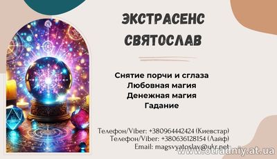 Маг Святослав - це людина, до якої звертаються по допомогу тоді, коли всі інші способи не дали результату. Його дар допомагає розкрити приховані причини життєвих проблем і знайти ефективне рішення. Святослав -